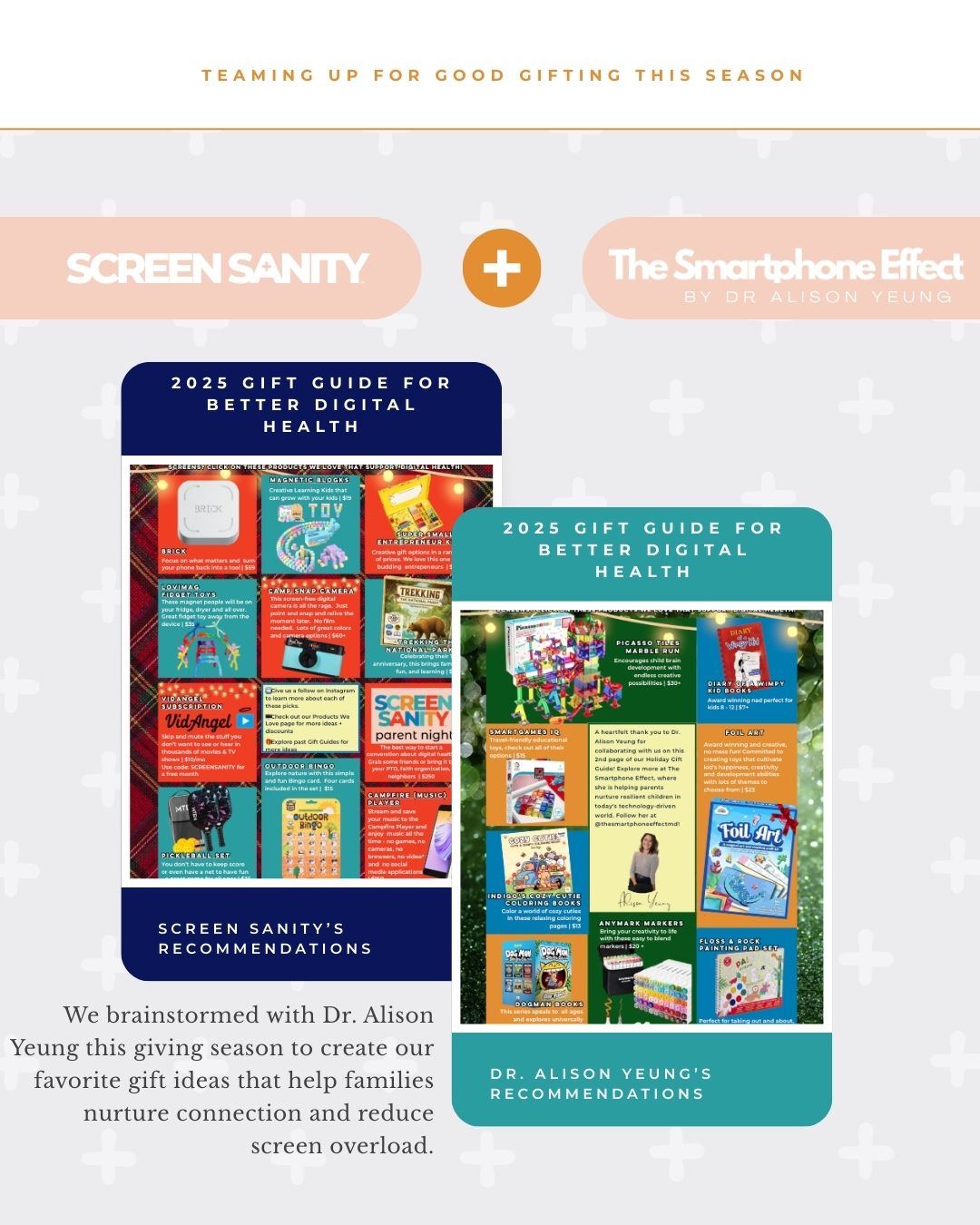 Together, we’ve created a simple, joyful 2-page guide filled with gift ideas that support healthier tech habits; a mix of analog delights and thoughtful digital choices for every age and stage. Our hope? That it makes holiday gifting a little easier, and helps your family lean into what matters most this season.